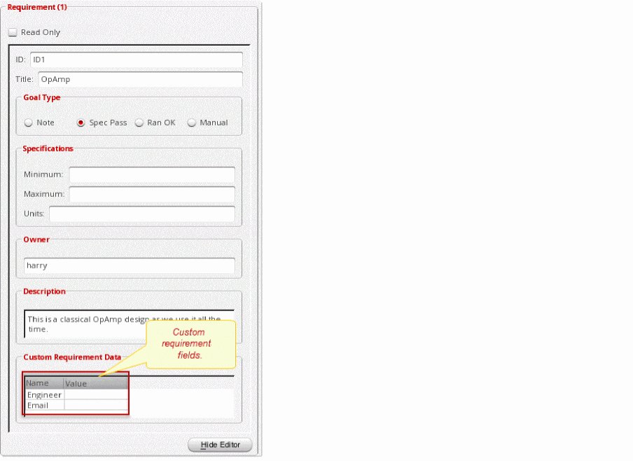 The Custom Requirement Data group box becomes available when you set the Verifier environment variable customReqFieldConfig.