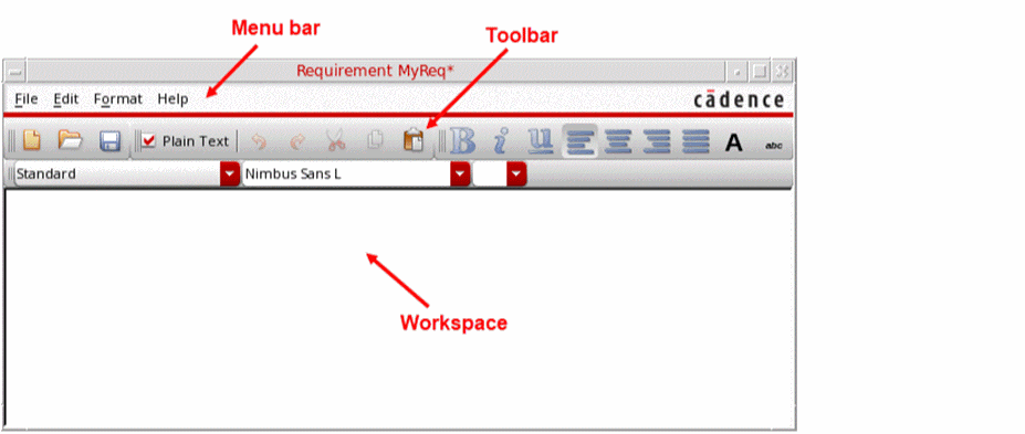 To access the description editor, right click a requirement in the Requirements pane of the Setup page, and select Edit Description. The editor window appears and displays the name of the selected requirement as the window title in the format Requirement <name>.