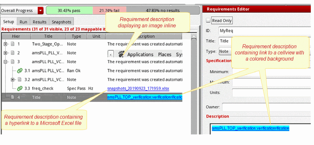 Using the description editor, you can add various HTML formats to text, add links to documents and cellviews, open the added documents and cellviews by clicking the links, as well as add images and display them inline. When you save the requirement description, the modifications are added to the requirement in the Verifier cellview. The documents, links, and formatting changes are saved in the documents directory and the images are saved in the images directory. These directories are available in the Verifier cellview directory structure. Therefore, when you use the SaveAs command from the Verifier toolbar, the documents and images included with the requirements are exported, and when you import a cellview, these documents and images are also imported.