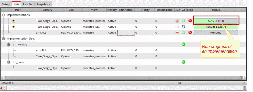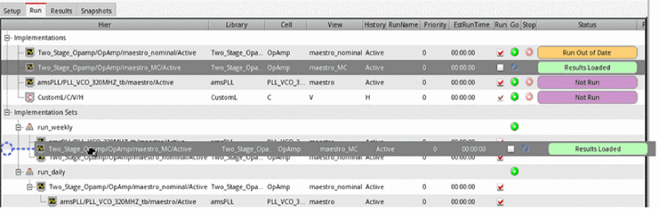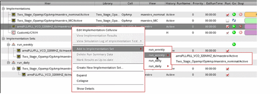For this example, assume thatrun_weeklyhas been created and some implementation cellviews are added to this implementation set. For more details, see Implementation Sets. -