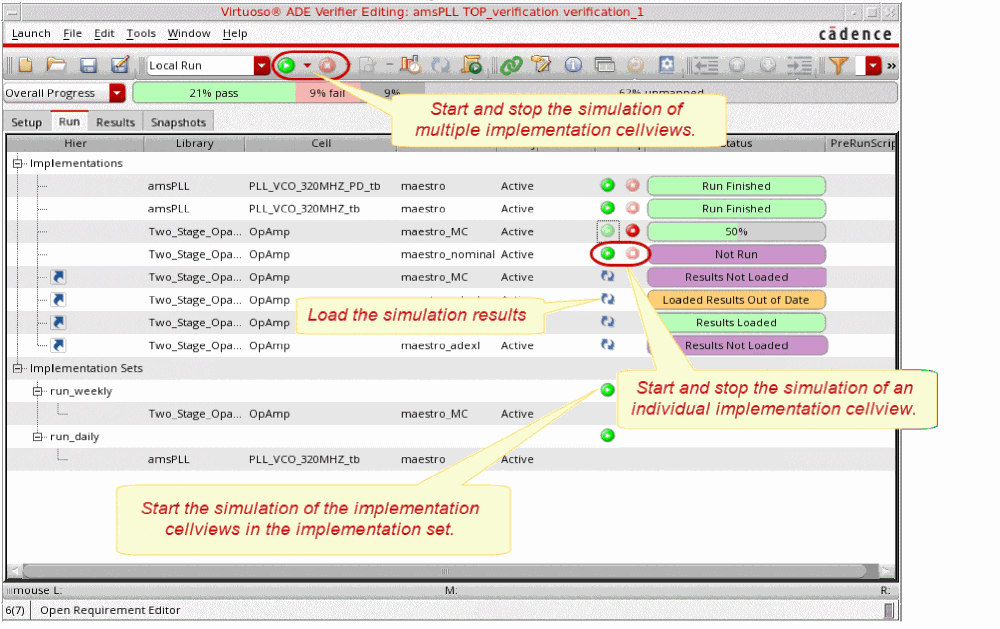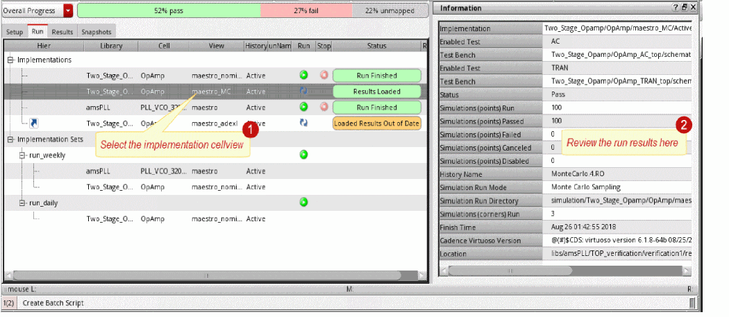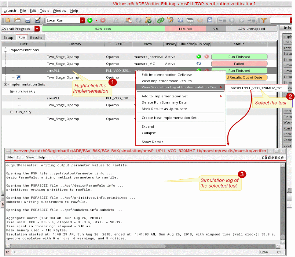 After an implementation cellview is run successfully, you can review its run results from Verifier, Virtuoso CIW, and the default Virtuoso application of the implementation cellview. You can also access the simulation log generated by the simulator for an implementation test run.
