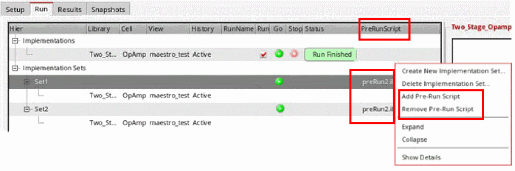 - Right-click an implementation set in the Run tab and select Add Pre-Run Script.