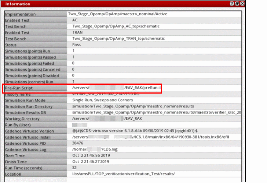You can observe the Pre-Run Script field populated in the Information assistant when simulation is complete. The Information assistant does not display the Pre-Run Script row if the pre-run script is not run because of errors.