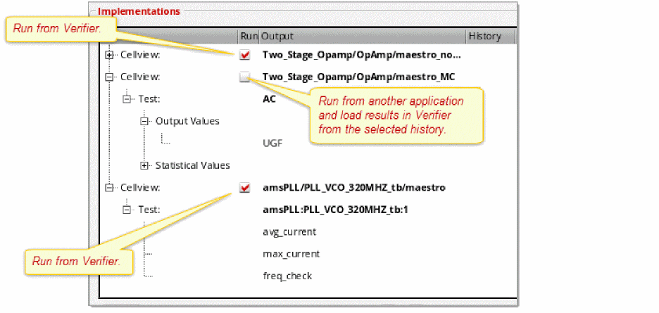 You can run an implementation cellview from Verifier to capture the results used for verification. Alternatively, you can run the implementation cellview from an external application and load its results in Verifier. In this case, you must select the cellview history where the results are stored and load them in Verifier.