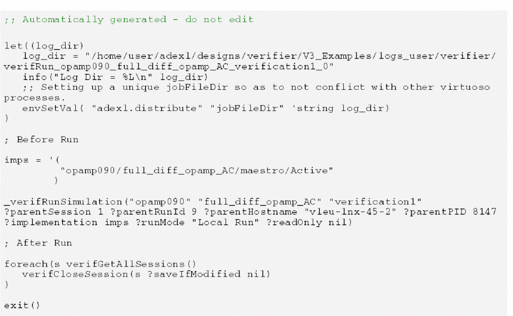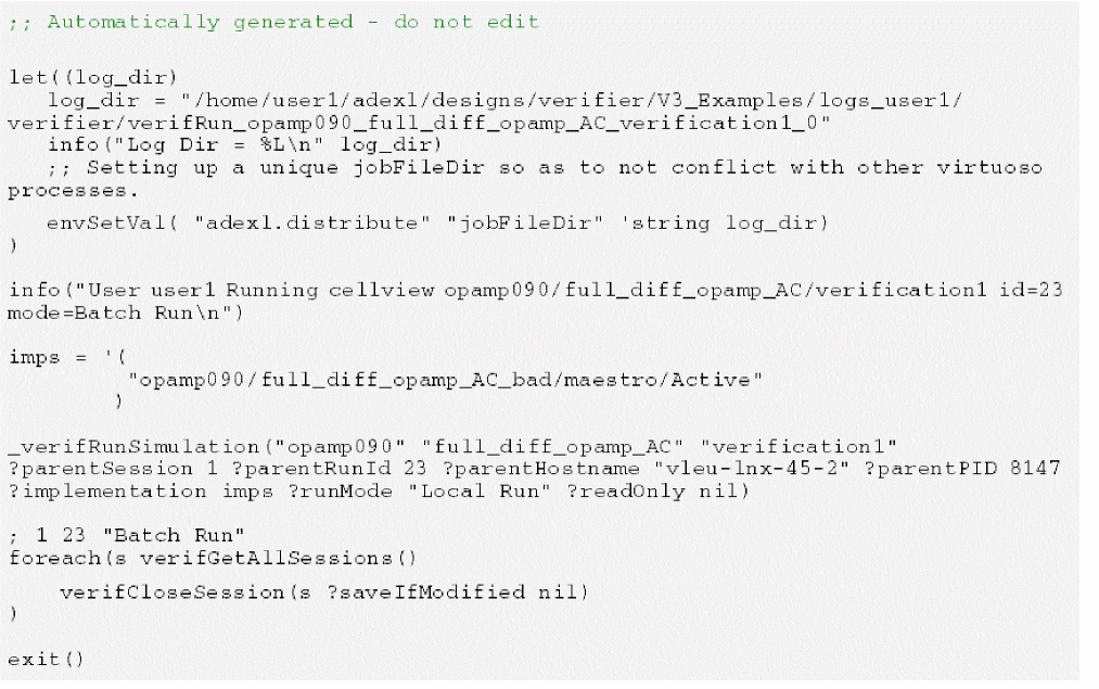 You can generate a batch script from Verifier, which is also referred to as a regression script. You can use this script to start Verifier from the command line in non-graphical mode with a cellview and run its implementation cellviews.