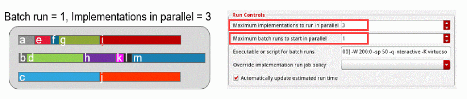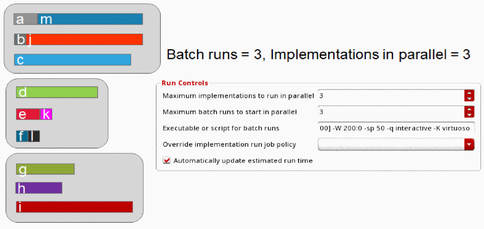 To run implementation sets in Batch Run mode and honor the Maximum implementations to run in parallel and Maximum batch runs to start in parallel settings, enable the distributeImpSet environment variable. To ensure that implementations within implementation sets are distributed according to these settings in batch mode, the implementation must not have any hierarchy or dependencies. In case of hierarchical implementation sets, all implementations of a hierarchical branch must be included in the same batch run, which makes it impossible to distribute these implementations between different runs.
