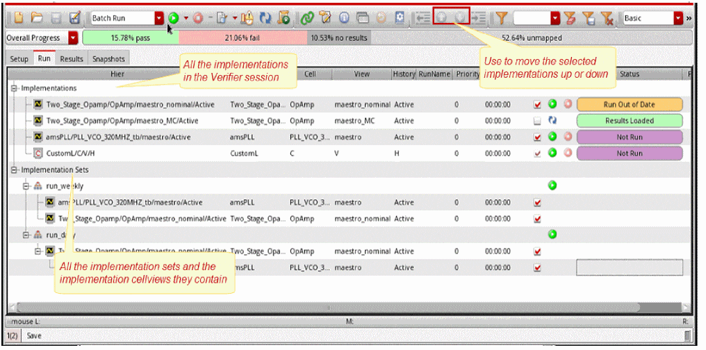 You organize and run the implementation cellviews of your verification project using the features available in the Run tab.