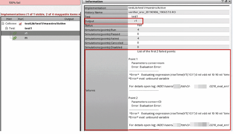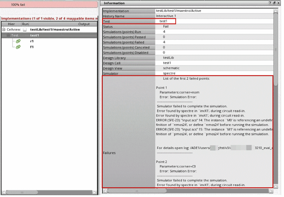 You can view the details of the tests or outputs that have failed simulation checks. These details are shown in the Failures row of the Information assistant. The Failures row shows the first failure from the complete list. However, you can control the maximum number of failed tests or outputs that are shown by using the environment variable.