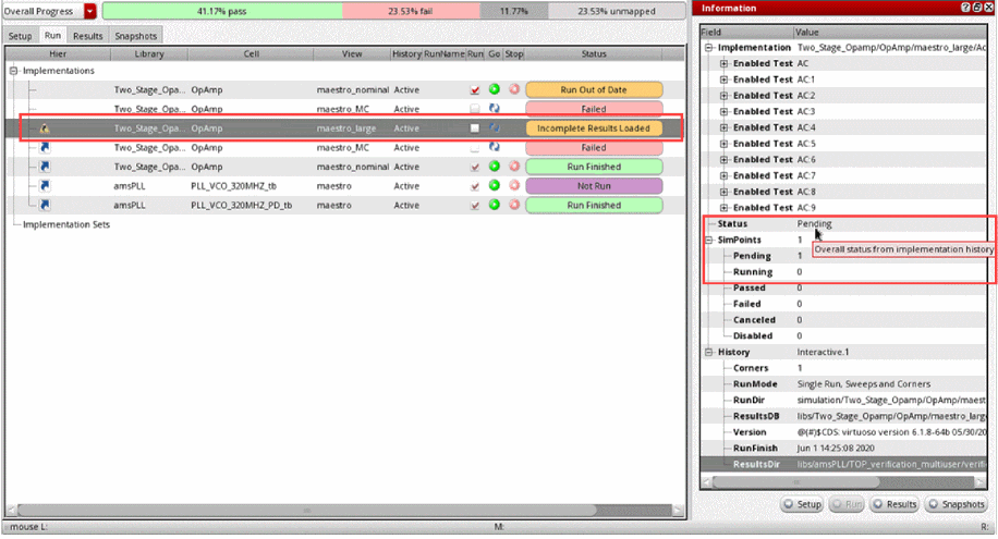 The Run page showsIncomplete Results Loadedin the Status column. When you click the implementation, the Information assistant displays Pending or Running in the Status column depending on the number of simulations or points that are still pending or running.