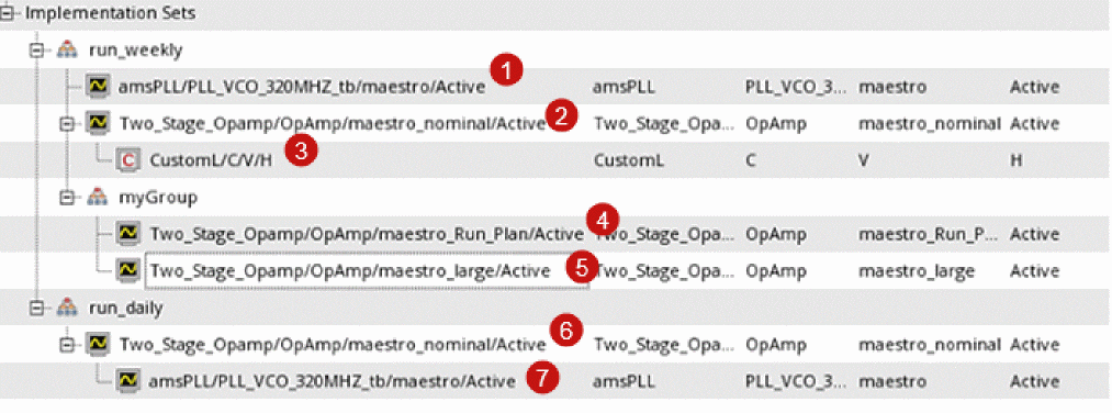 As shown in the following figure, all the implementation cellviews appear under the Implementations node. You can optionally create implementation sets to group the implementation cellviews according to your needs. For example, you can group them according to their run frequency. You can create a set called run_daily to group the implementation cellviews that must be run every day. Similarly, you can create run_weekly to group the implementation cellviews that must be run once a week. You can then choose to run all the implementation cellviews that belong to an implementation set. An implementation cellview can be included in multiple sets.