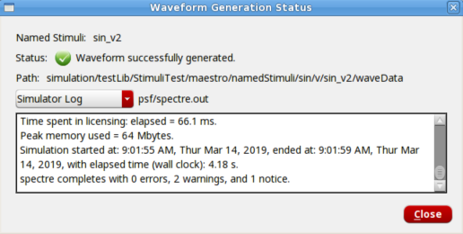 Ensure that the Authoring mode is On and Preview Transient Waveforms is set to Show in the Stimuli Authoring section. Then, click Wave Status at the bottom of the Stimuli Authoring section. This opens a message box, Waveform Generation Status. You can select one of the following options from the drop-down list: Simulator Log, Graphical Stimuli File, or Variables (ParamSet).