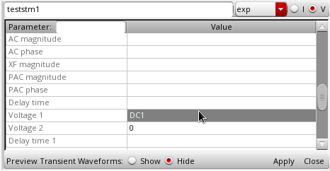 You can also use an expression containing design variables to define a parameter value in stimuli. For example, DC voltage can be set to DC1+V1.