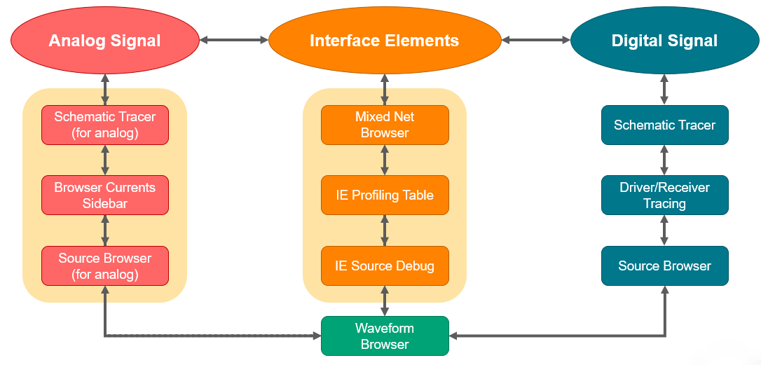 The following table lists the various windows/tools within SimVision MS that provide access to the analog and digital components of a mixed-signal design.