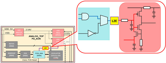 Consider the following illustration where the mixed-signal boundary is connected with a connect module L2E. Using SimVision MS, you can go in to the source code of the connect module and then descend into the analog schematic to debug the analog circuit.