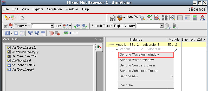 To view the performance of the connect modules in a waveform, right-click a connect module instance in the right pane of Mixed Net Browser and select Send to Waveform Window. Alternatively, select the connect module and click in the toolbar.