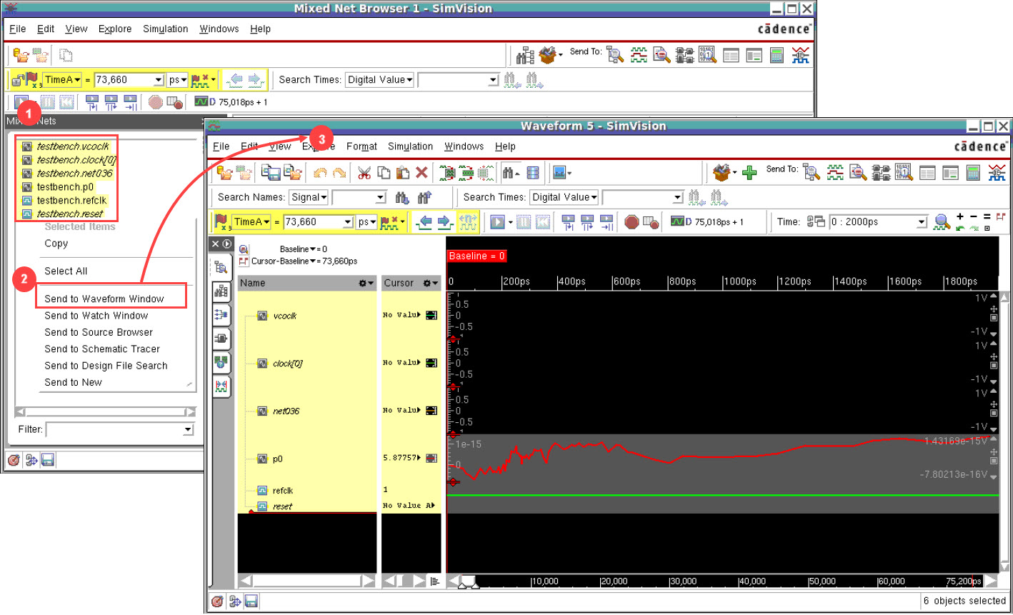 To generate a waveform plot, select a net in the Mixed Nets sidebar and select Send to Waveform Window. Alternatively, select the net and click in the toolbar.