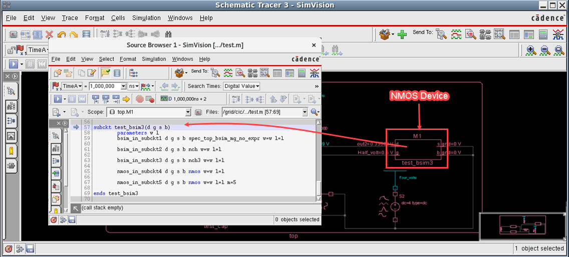 For example, the highlighted symbol in the image below is an NMOS device. It is represented in a rectangular box in Schematic Tracer. When this symbol is sent to Source Browser, the name of the subcircuit and the other details of the symbol can be found.