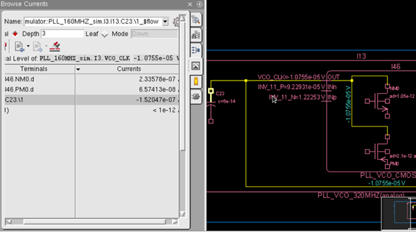 According to Kirchhoff's Current Law, the sum of currents on a nodes is equal to 0. However, Spectre notates currents in a different way. Spectre solver notates the current value reporting on a subcircuit or a primitive as a positive value '+' when the current enters the port and a negative value '–' when the current flows out in the reverse direction. SimVision MS follows current direction conversion model of Spectre. Therefore, in the Browse Currents sidebar, the current value of a terminal is positive if current is coming in and negative if current is going out.