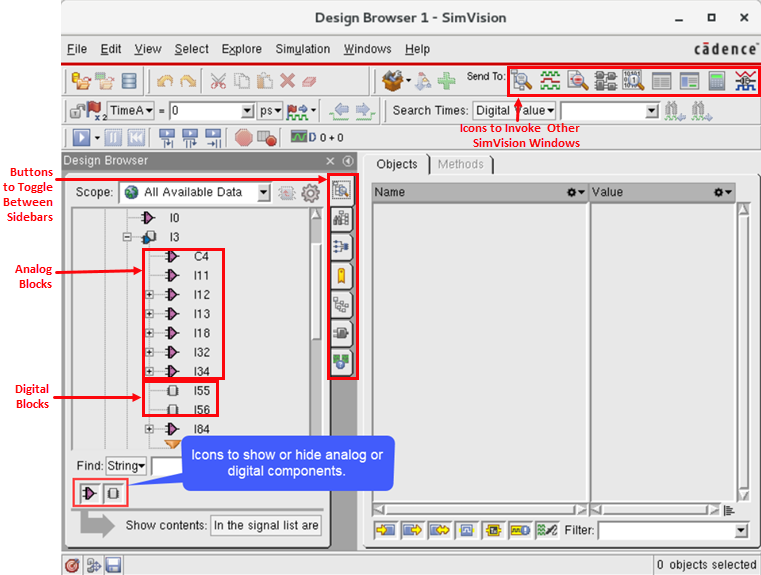 The Design Browser window lets you access the objects in your design. You can use it to locate the signals and variables that you want to debug. You can also select objects in Design Browser and send to the Schematic Tracer or the Waveform window for further analysis.