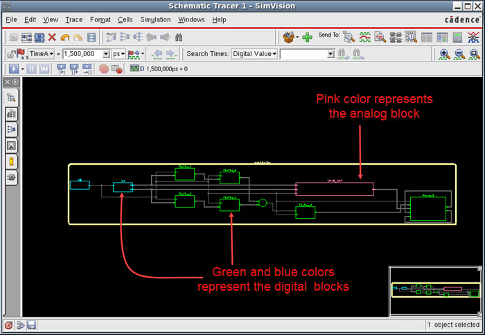 Schematic Tracer in SimVision MS extends support to display the analog circuit with the digital devices of a mixed-signal simulation and overcomes the challenge to debug a complex mixed-signal design.