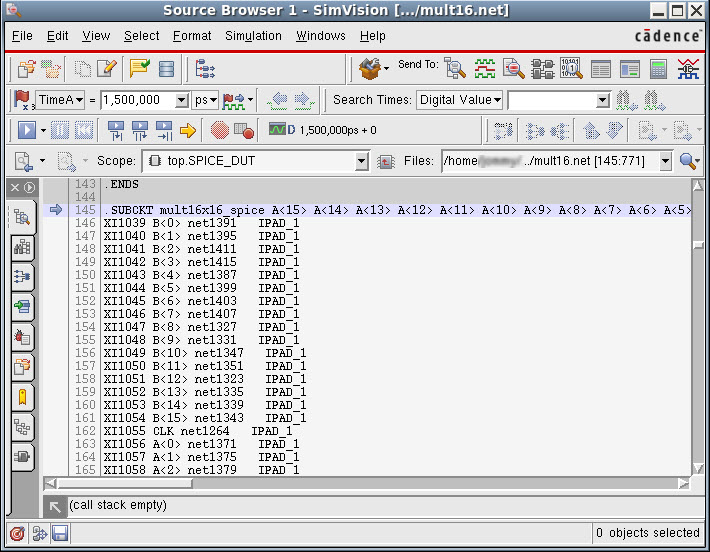 Source Browser can be invoked using the icon on the toolbar. It can also be invoked using the right-click option, Send to Source Browser, from the other Simvision MS windows. When launched, Source Browser looks like the following image.
