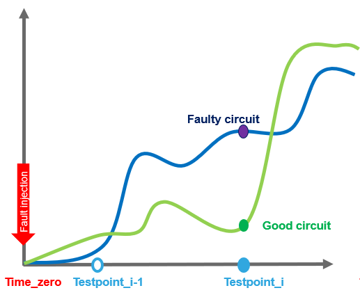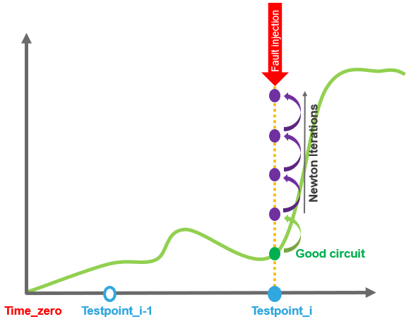 Transient Fault Analysis: To address the challenge of long simulation time, a new algorithm has been implemented in transient fault analysis. In this simulation flow, a circuit with fault list is simulated together with the fault times specified on the time axis. Spectre starts regular transient analysis till the time reaches the fault time point. Then, at each fault time, following actions are performed: