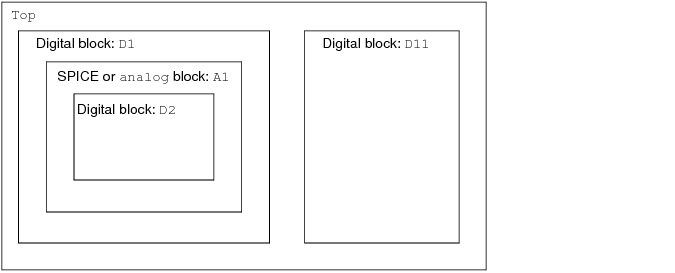 If top.D1.A1 is a SPICE block introduced through an amsd block or a modelpath setting, there is no need to specify the discipline because the use of the amsd block or modelpath setting indicates that the SPICE or Verilog-A block is an analog block of the electrical discipline. In this case, you need to specify settings only for the digital blocks.