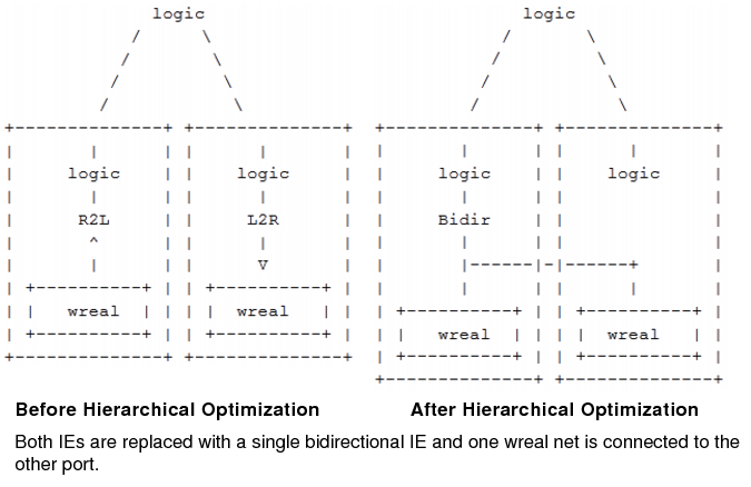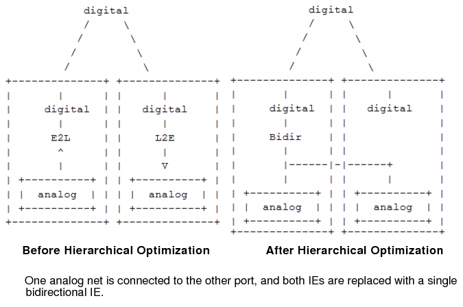 Hierarchical IE optimization is enabled by default. Hierarchical IE optimization is supported in the AMS-CPF flow. Currently, IE optimization is applied on nets only if the drivers/loads of the nets are associated with the same power domain.