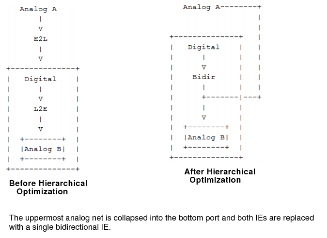 The interface elements (IEs) that are instantiated at any point on a hierarchical digital net can be combined into one. As a result, all IE-connected nets are collapsed while still maintaining the connection between the analog and digital nets. For this, the following criteria must be met: