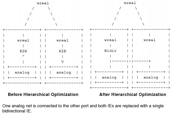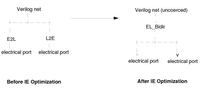 In Interface Element (IE) optimization between dissimilar nets, the elaborator inserts a bidirectional IE to collapse the electrical signal onto the real just like two electrical signals are collapsed in normal IE optimization. The structure of the resultant optimization depends on the following: