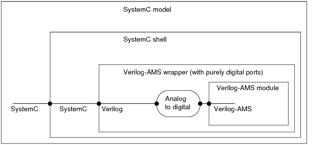 SystemC is a digital-only language. For that reason, the Xcelium simulator with mixed-signal option uses Verilog-AMS wrappers with purely digital ports and SystemC shells to instantiate Verilog-AMS and VHDL-AMS modules within SystemC. Verilog-AMS wrappers are required only if the Verilog-AMS and VHDL-AMS modules contain a mix of analog and digital ports. Instantiations of Verilog-AMS and VHDL-AMS modules (which have purely digital ports already) do not require wrappers and use only SystemC shells. To translate analog signals to and from the digital signals of the SystemC language, Xcelium simulator with mixed-signal option uses connect modules and interface modules.