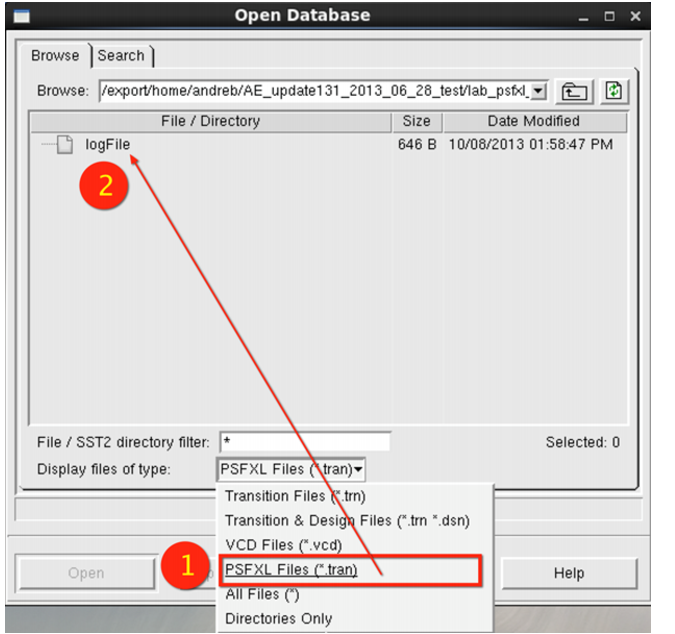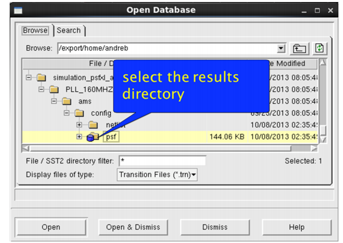 To display the unified database containing only the analog container in SimVision, expand the results directory, choose PSFXL Files (*.tran) from the Display files of type drop-down list, select logFile (created during simulation), and click Open & Dismiss.