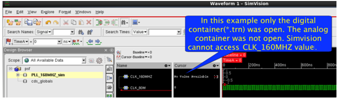 Though it is possible to open only the simulation digital (*.trn) container results during post-processing by selecting Transition Files (*.trn) from the Display files of type drop-down list, it is not recommended, because in this case, SimVision is not able to plot the analog vector values that are stored in the analog container. For such cases, SimVision displays No Value Available, as shown below.