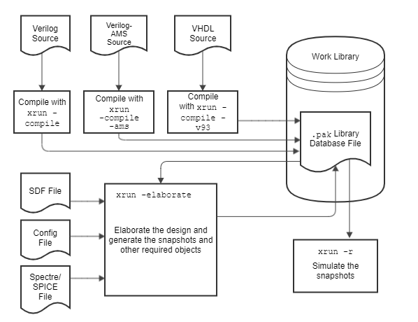 The elaborator stores snapshots of your design hierarchy in the library database file along with other intermediate objects from compilation and elaboration. The simulator uses these snapshots during simulation. See also Illustrating the xmelab Process.