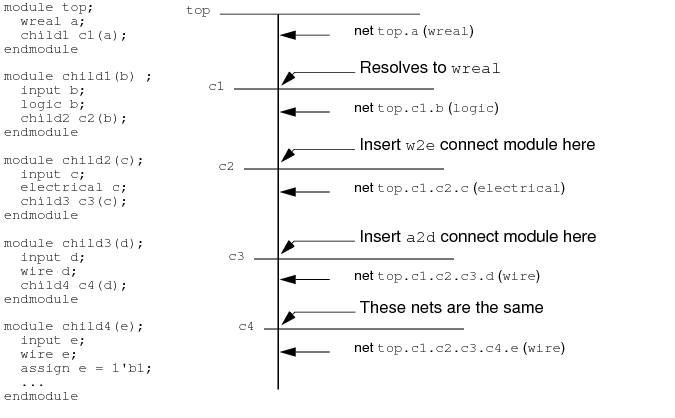 module top; wreal a; child1 c1(a); endmodule module child1(b) ; input b; logic b; child2 c2(b); endmodule module child2(c); input c; electrical c; child3 c3(c); endmodule module child3(d); input d; wire d; child4 c4(d); endmodule module child4(e); input e; wire e; assign e = 1'b1; ... endmodule