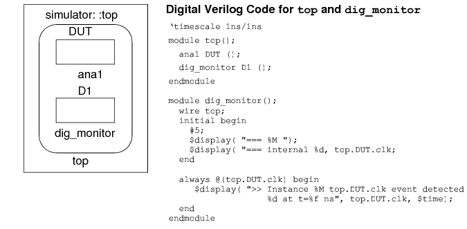 module top(); ana1 a1 (out1); mycell m1 (a, b); dig_monitor D1 ();endmodule