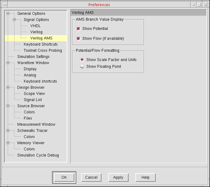 The Preferences form appears. - Under General Options (on the left side of the form), select Signal Options - Verilog AMS.
