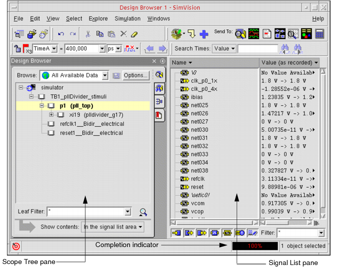 The Design Browser contains two primary panes. On the left is the Scope Tree pane, which displays your current design hierarchy in a graphical tree representation. On the right is the Signal List pane, which displays a list of signals with their current simulation values. The completion indicator appears at the bottom of the window.