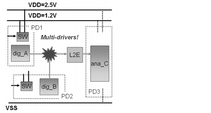 Consider a situation where an analog signal is driven by multiple digital drivers that take different nominal conditions from one or more power domains, such as the example shown below. Modules dig_A and dig_B belong to power domains PD1 and PD2, both of which are switchable power domains with a nominal condition of 1.2V and 2.5V. When the two modules drive the same port of an analog block ana_C, it is the case of multiple digital drivers in AMS-CPF.