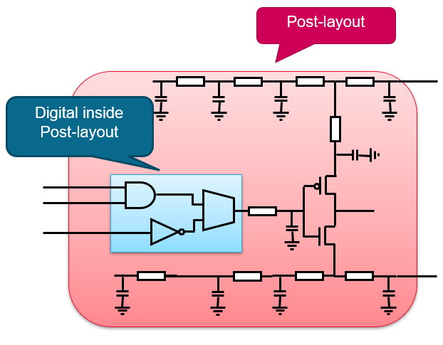 AMS Designer allows usage of a digital module inside DSPF for post-layout simulation. Using DSPF-in-the-middle speeds up mixed-signal post-layout simulation and it enables running verification as early as possible.