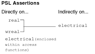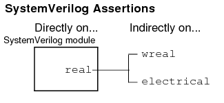 The AMS Designer simulator lets you use SystemVerilog Assertions (SVAs) on SystemVerilog real variables (or ports) that connect to or electrical nets, and PSL assertions on real and Verilog-AMS wreal nets that connect to electrical nets.