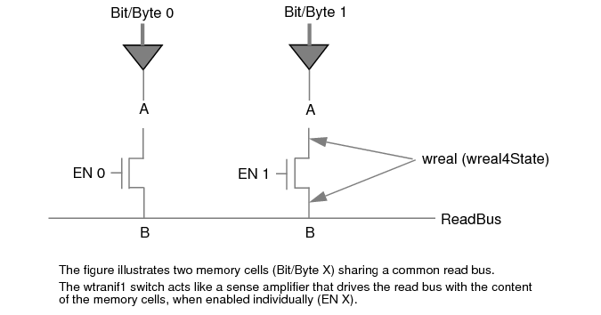 In the above example, if the enable is high and only one of the model ports is driven, that value is passed to the other side. For cases where both ports are driven and the enable is high, both sides of the pass gate resolve to wrealXState. If the enable is low, both sides of the pass gate are isolated from each other (the pass gate drives out `wrealZValue). If the enable is X or Z, both sides resolve to `wrealXState.