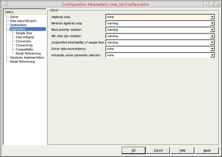 The Configuration Parameters form appears. - In the Select tree, select Diagnostics.