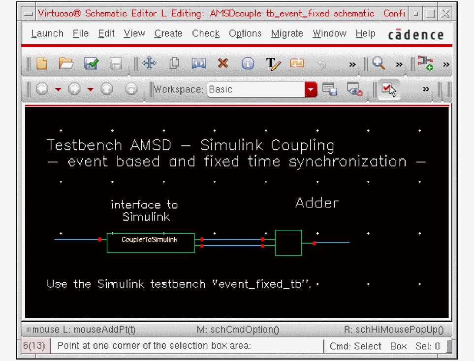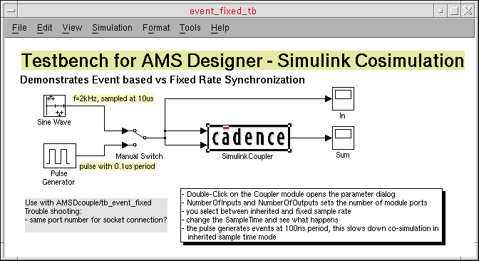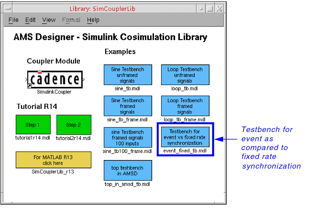 In the Library: SimCouplerLib window, double-click Testbench for event as compared to fixed rate synchronization.