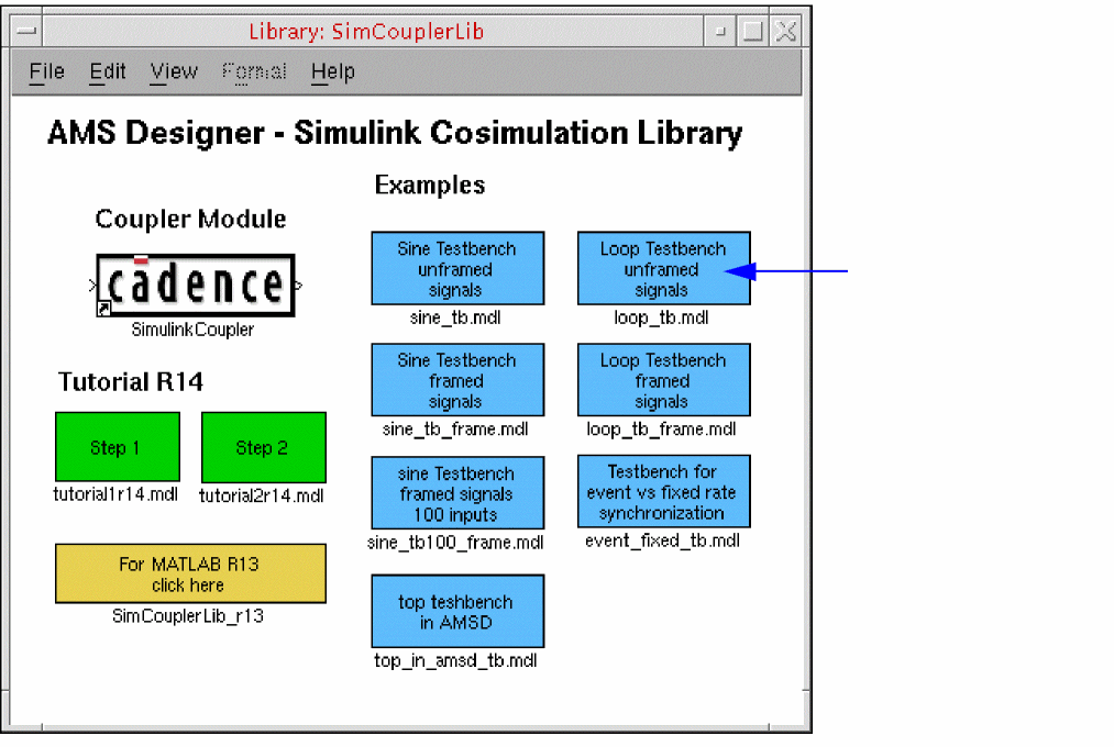 In the Library: SimCouplerLib window, double-click Loop Testbench (framed signals).