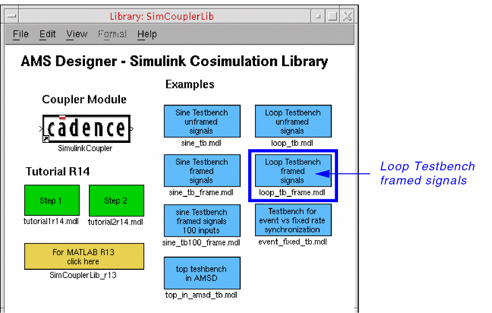 In the Library: SimCouplerLib window, double-click Loop Testbench (unframed signals).