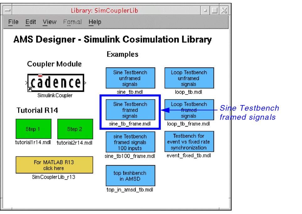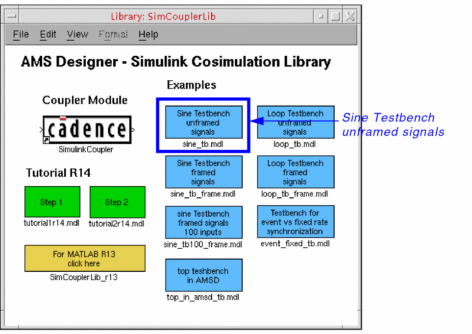 In the Library: SimCouplerLib window, double-click Sine Testbench (framed signals).