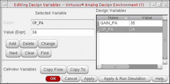 The Editing Design Variables form appears. - If the GAIN_PA (gain) and CP_PA (compression point) design variables (for the RF power amplifier) do not already appear in the Design Variables table on this form, click Copy From.