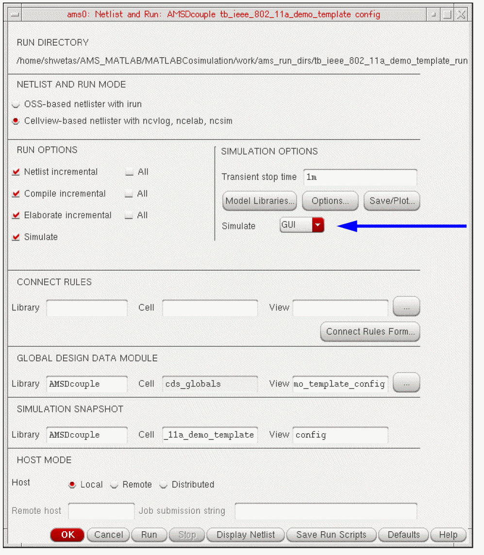 The Netlist and Run form appears. In the SIMULATION OPTIONS section of the form, notice that the Simulate option is GUI.