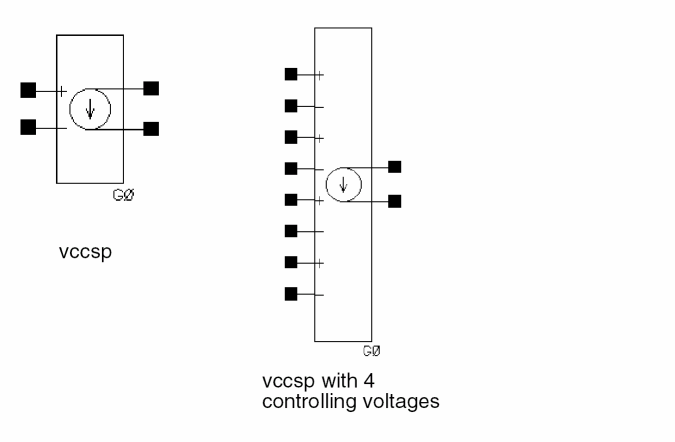 vccsp is a Pcell-based voltage controlled current source in which the symbol varies with the number of controlling voltages. vccsp is similar to vccs except that it has one additional parameter (nc) that specifies the number of controlling voltage sources.
